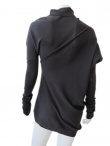 Abito color marrone scuro in pura lana merino, scollatura sciallata e alta, maniche lunghe mezzo guanto, effetto twister nel fondo.