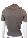 Cardigan a mezza manica, linea corta in vita con caneté alto, effetto restringente. Chiusura nascosta con ganci con grandi bottoni decorativi con pietre fantasia Art Decò. Collo molto particolare che scende sulle spalle con frappe e arricciatura che girano attorno al collo.