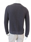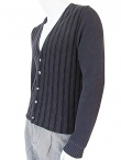 Cardigan colore marrone scuro, scollatura a V, senza revers, allacciatura con bottoni Union Knopf, in cotone e carta, per una visione ecologica della moda, taglio semi-aderente, senza tasche, in bi-tessuto: liscio nelle maniche e nel dietro, a caneté sul davanti, effetto ondulato. Classico nel taglio ma stravagante nel dettaglio, per questa contraddizione potrebbe essere indossato dal bravo John Malkovich.