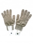 Guantini in filato di lana ecofriendly con bordo a coste e inserto in tessuto di colore in contrasto con bottone a pressione per unirli.