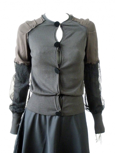 Roundnecked jacket fastened on the front with big covered buttons in clashing colour, sleeves with applications in lace and silk-georgette