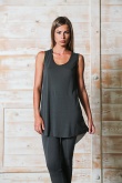 100% silk sleeveless top with a jersey front and to below the shoulders in the back. A loose, A-line fit, longer and rounded in the back. Double fabric inserts on the back which are joined and criss-crossed with leather strips. Double strips of leather which form the pattern along the neckline and armholes. Unfinished bottom edges.