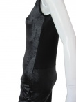 Black sleeveless sheath dress, jewel neckline, laminate treatment making that makes it shiny.