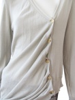 Cardigan in ecofriendly cotton in beige with fastener on the side, twister effect. Characterized by an asymmetric drape, longer on the right side and V-neck. Union Knopf buttons. Perfect for who has a daily elegant and sophifisticated way to dress, as the actress Katie Homes.